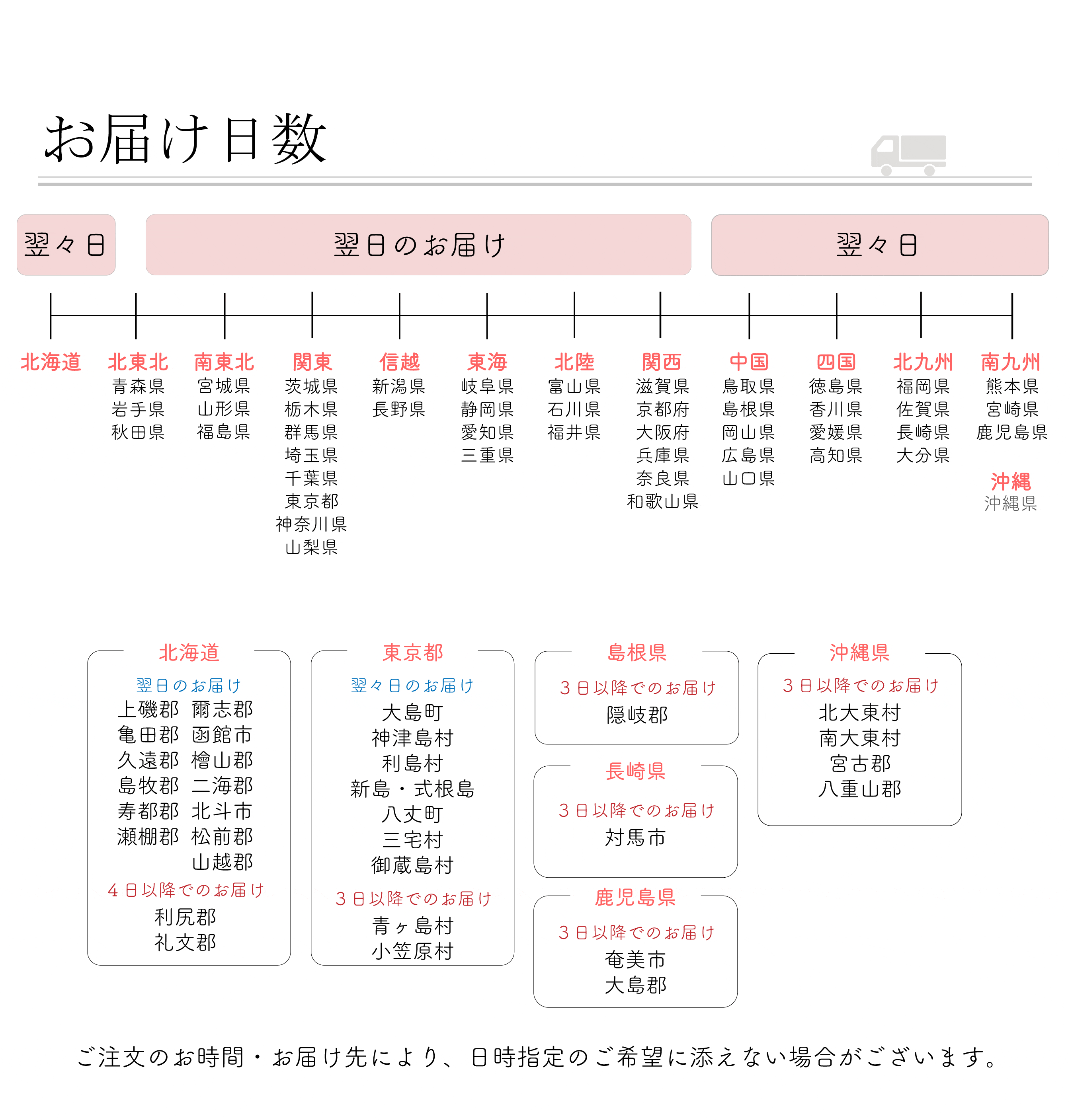 ただし、天災、気候によりお届け日が遅れる事もございます。