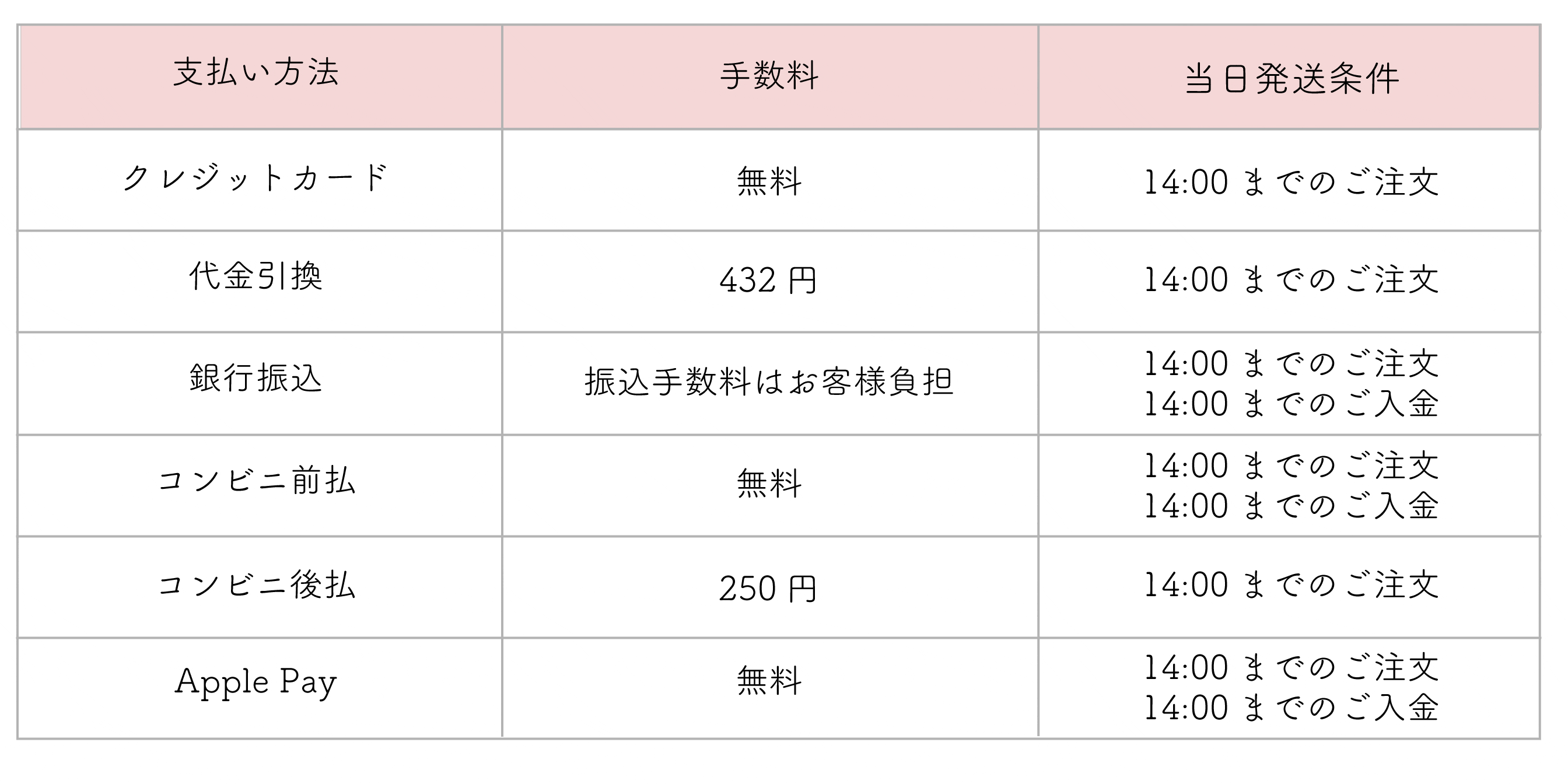 ※発送前支払いの場合は、お客様のご入金タイミングにより、お届け予定日が前後することがございます。支払い方法ごとの発送予定日