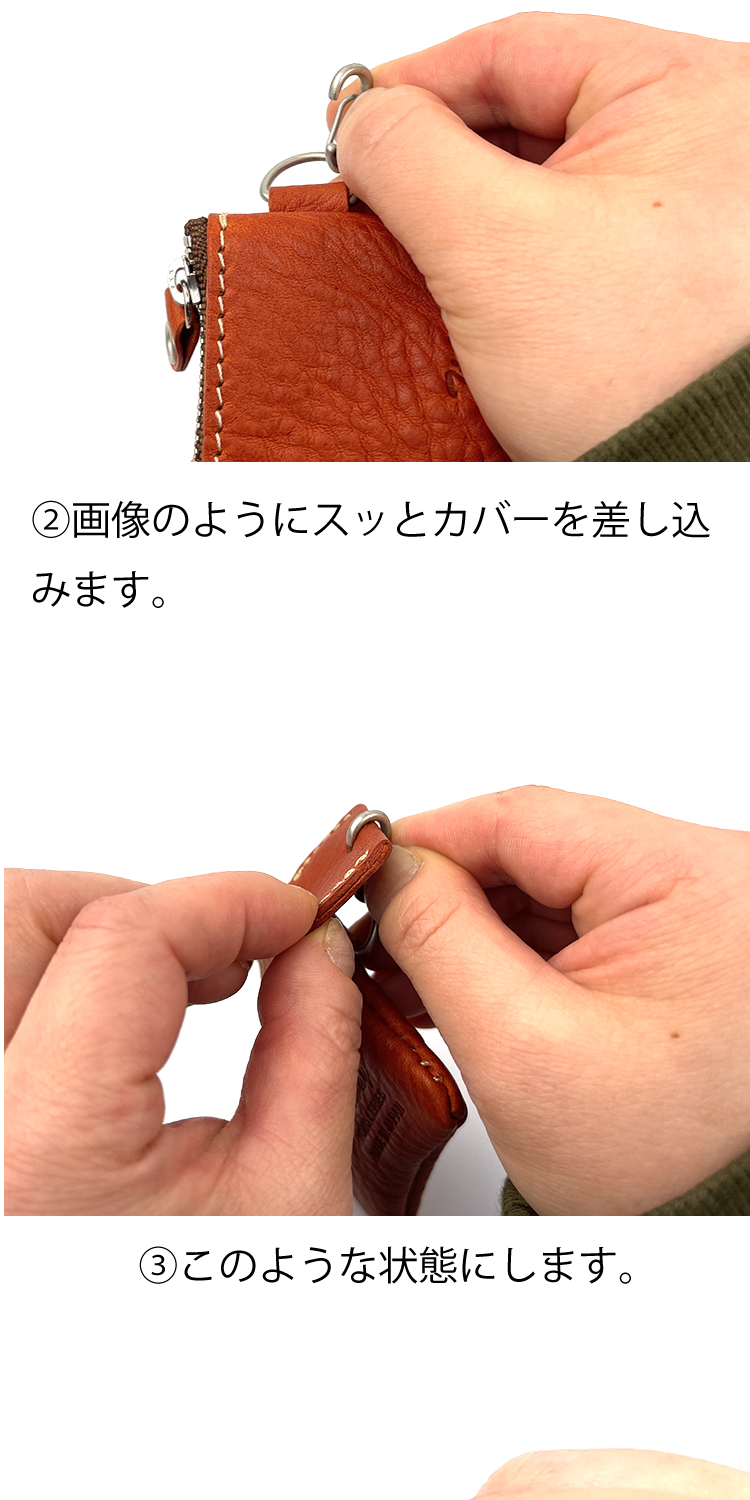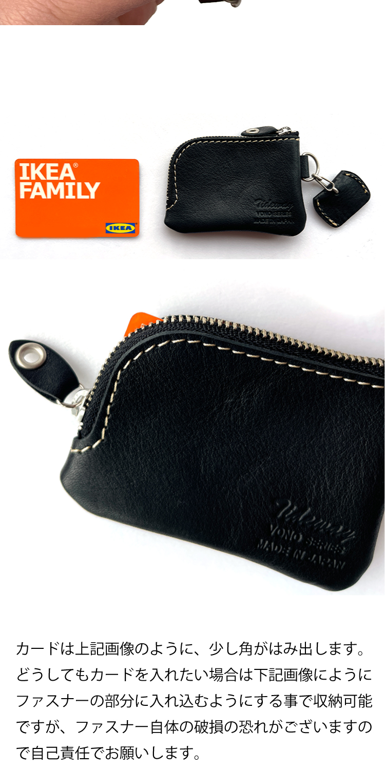 どうしてもカードを入れたい場合は下記画像にようにファスナーの部分に入れ込むようにする事で収納可能ですが、